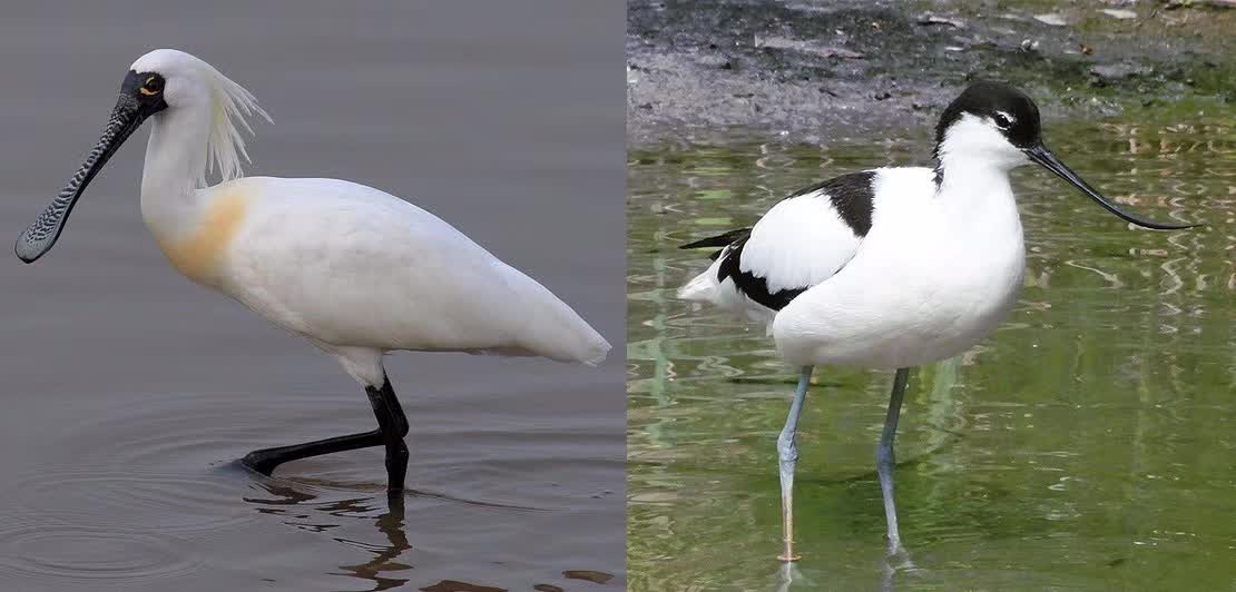 黑脸琵鹭与反嘴鹬,后者也是勺嘴鹬的亲戚。图片:Cp9asngf、Jutta234 / wikipedia
