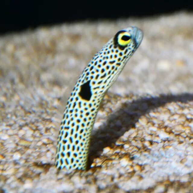 在日本一些大型海游馆,你还能见到另一种花园鳗——大斑园鳗Gorgasia maculata,身体呈灰色,两侧各有一排白色斑点点,靠近头部有个大的白色斑块,整个儿看上去就好像被缀了珍珠一样。