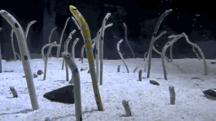 水族馆投喂饵料时,原本岁月静好的花园鳗们会瞬间把头转到一个方向,然后像疯了一样上下晃动,群魔乱舞。你以为花园鳗high了?实际人家只是在正常地用餐而已。