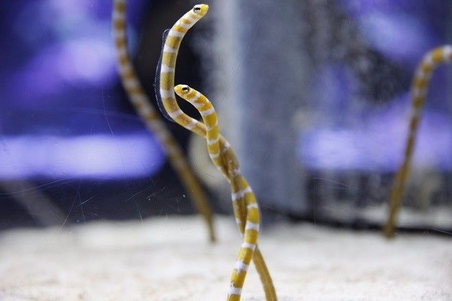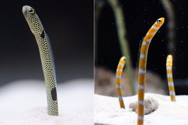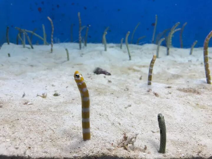 在国内外一些大型水族馆中,你经常能见到一个铺满厚厚一层白沙的海水缸,总有些棒状的生物从沙子里探出身子,随着水流左右下上晃动。今天我们要介绍的就是它——传说中的治愈萌神,花园鳗。