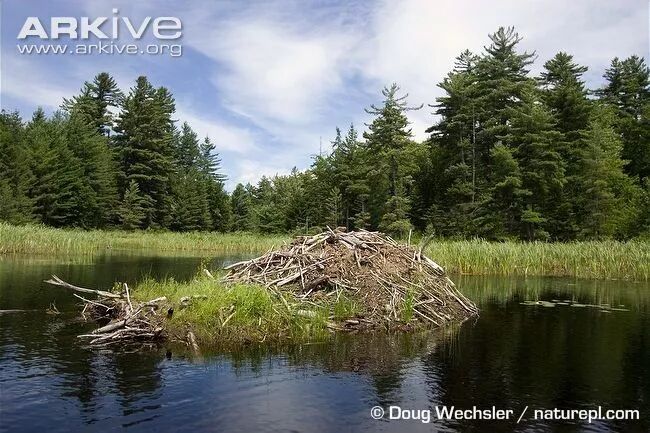 河狸巢穴的主体是一个结构复杂的“构筑物”。它们通常会在自己栖息地的水体当中选择一块相对干爽的小沙洲或者湿地——通常如果上面能直接找到一棵树的话会更好——用软泥、草、落叶和小树枝铺出一片“地基”。河狸会将木头沿水路搬运到这片地基之上,用树枝和泥土、碎石等,一层一层地搭建出一个巨大的拱顶,而这就是整个河狸家族生活起居的场所。