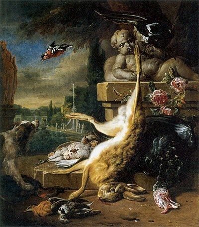 17世纪的荷兰,所谓“黄金时代”的静物和日常写生非常盛行,而各个画家所精通的对象也各有不同。有一位叫Jan Weenix的画家,就十分擅长画一只脚被吊起来的野兔(很可能是被猎人下的圈套捕到的)以及其它与打猎归来相关的场景。