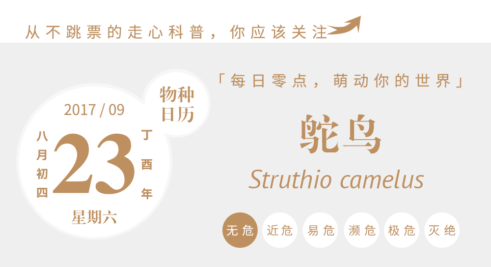 今年一月我们已经介绍过一种大长腿的动物——鸸鹋[ér miáo]。虽然它长得和今天的主角鸵鸟(Struthio camelus)非常相似,但客观地说,它们的亲缘关系并不算太近。