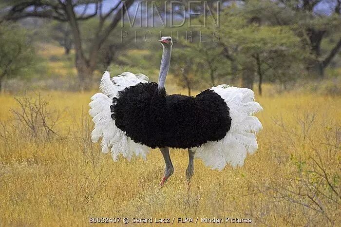 一言不合就开屏!成年雄鸵鸟的初级飞羽和尾羽,均为白色,其它羽毛为黑色。图片:Gerard Lacz
