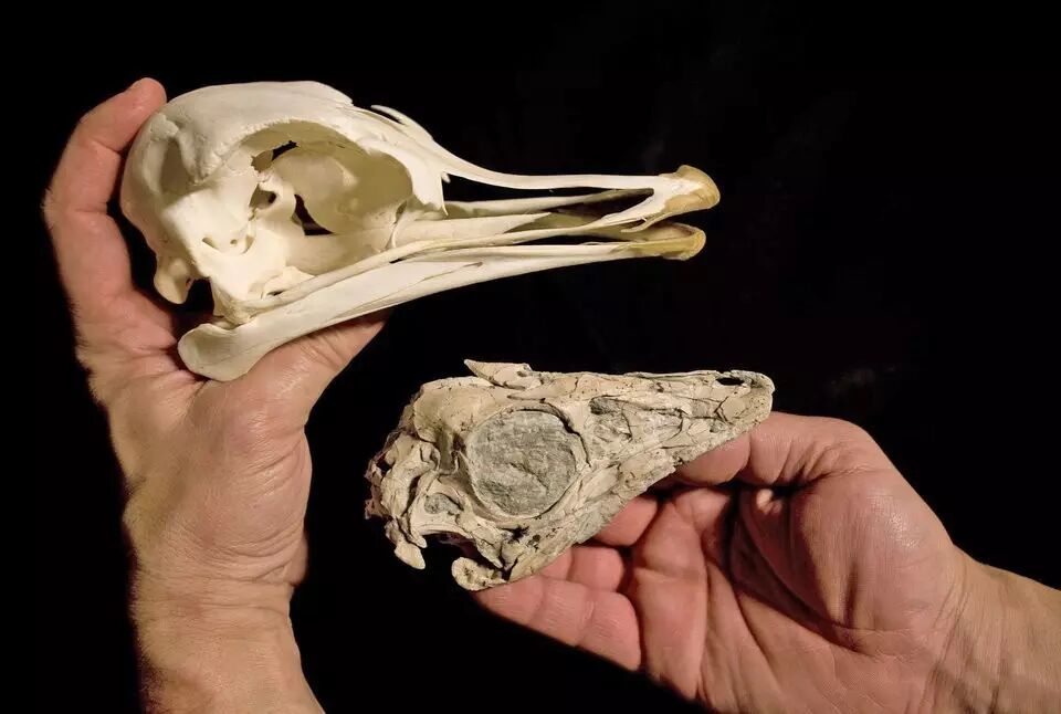 图片左侧是鸵鸟的头骨,而右侧是某种似鸟龙的头骨化石。图片: newsok.com