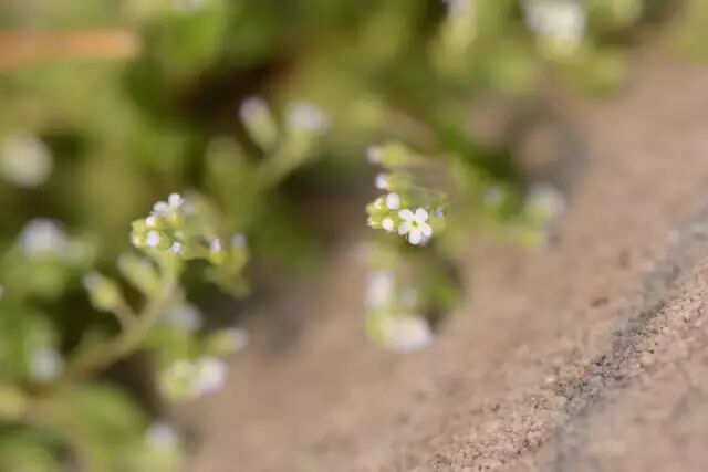 离开丛林之后的勿忘我,在人类的改造下愈发可爱。但就在它的旁边的花坛砖缝里,一枝纤细的附地菜也在开花,花小极了,需要定睛良久才能看得清楚。四下安静得出奇,我似乎听到它也在悄悄地对我说,不要忘记我。