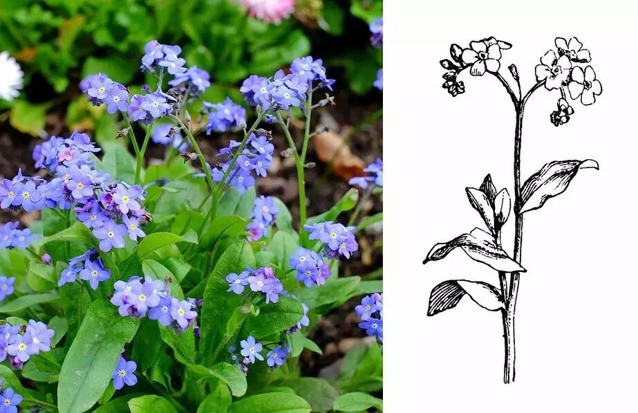 想在人类世界遇到真正的勿忘我,得去植物园的花坛找找。因为它害怕炎热,所以在人类栽培下它在早春就可以开花。勿忘我天蓝色的花朵堆砌着,蝎尾状聚伞花序让两脉对生的花枝弯曲成心型。