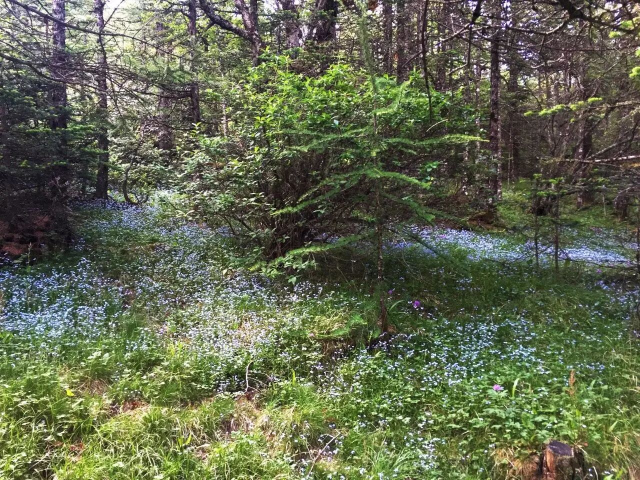 走在树林边缘上,厚厚的落针叶踩着很软,而太白红杉的枝叶并不封闭,可以透过去看到被晨光照亮的林间空地,在那片发亮的绿色上,透着星星点点的蓝色。忍不住过去看看,走近了才发现是一大片开得正好的勿忘我。
