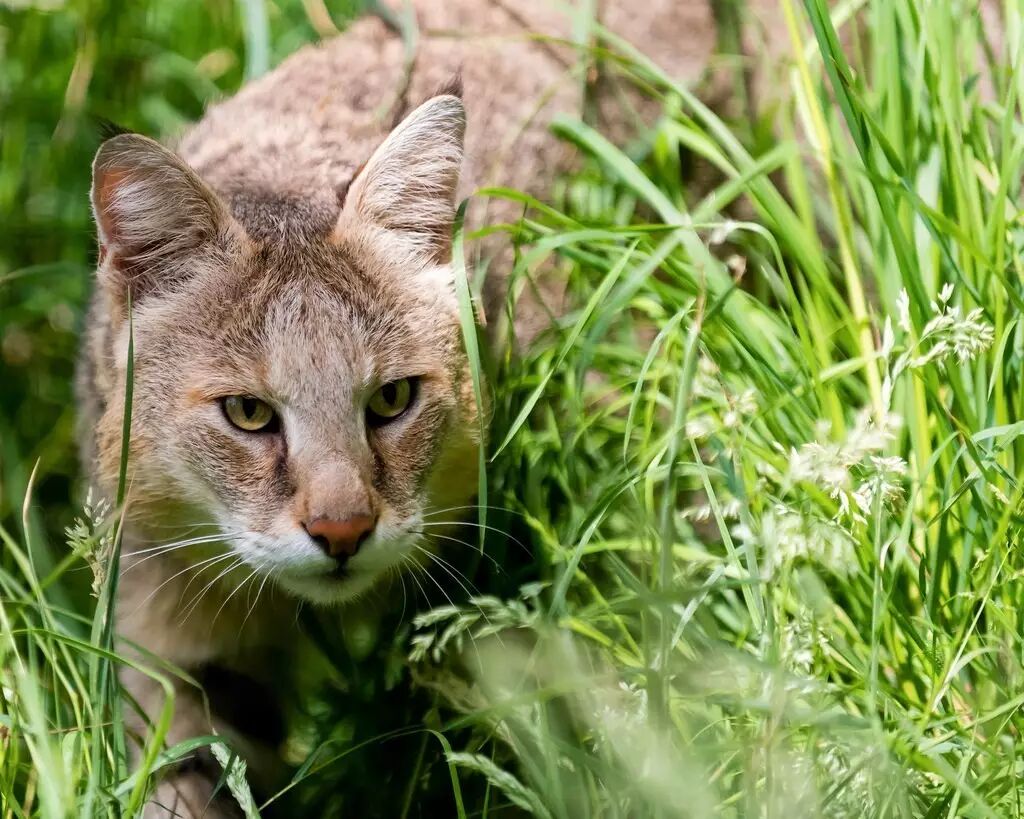 丛林猫的外表应该还是很难和猞猁弄混的:苗条的身材,两米八的大长腿,瓜子脸,竖起的大耳朵,白色的嘴和粉红的小鼻头,无论怎么看都透着一股网红的气质。