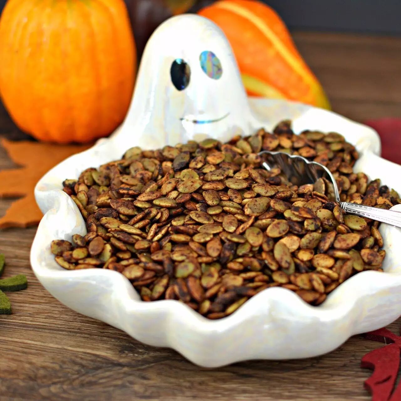 雕刻南瓜灯时去掉的种子也不会被浪费,会做成万圣夜的节日零食——烤南瓜子。这种烤南瓜子和我们的炒瓜子异曲同工却又不同,具体做法是把南瓜子用水冲洗但不必洗得特别干净(带着一点胎座组织味道更好),然后把它们放在浓盐水中浸泡半天,排干盐水后加油拌匀,可以随自己喜好加入各种调味料,然后放进烤箱中烘烤就行了。