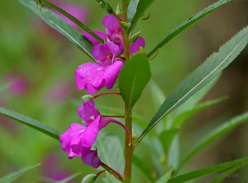 凤仙花Impatiens balsamina是一种高大的一年生草本植物。它的分枝不多,直立向上的茎十分粗壮,带有锯齿的狭长叶片在上面互生。从远处看,就好像一根根大鸡毛掸子戳在地里,五颜六色的花朵就着生在植株上部的叶腋处。