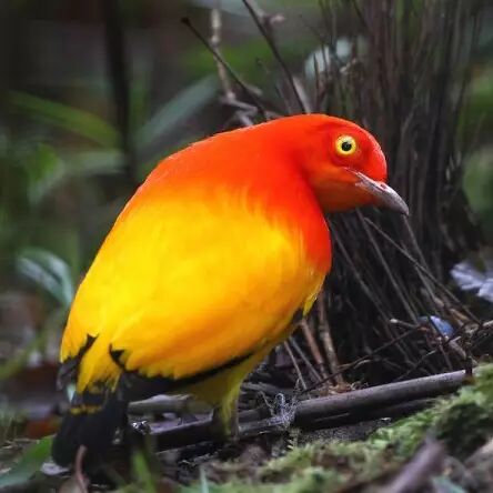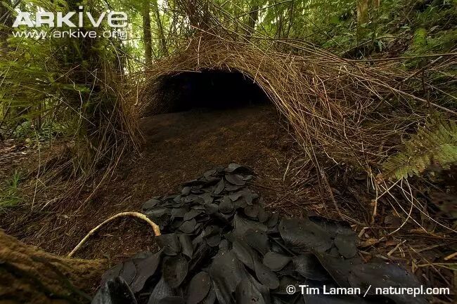 3)雄阿氏园丁鸟(Archboldia)用蕨类的叶子在地上铺出一片区域,其上再以甲虫、蜗牛壳和蓝色的果实装饰,而整片区域上方的粗树枝都会被雄鸟挂上很多兰科植物的茎作为装饰,但会空出几个专门的栖枝站在上面向雌鸟炫耀;