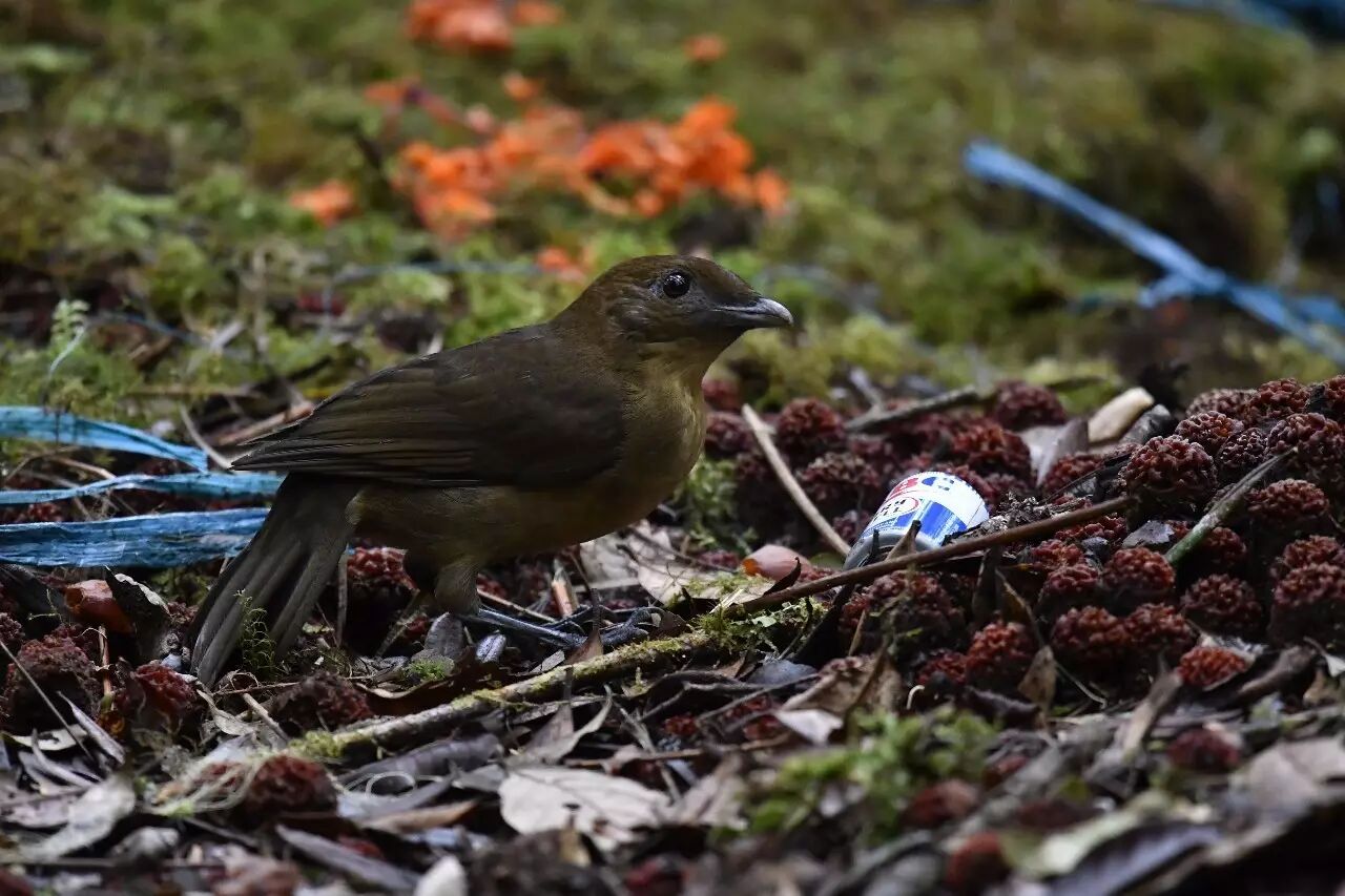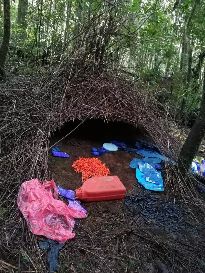 掺杂有大量人类塑料垃圾的褐色园丁鸟求偶场,本文作者摄于阿法克山海拔约1300米处。