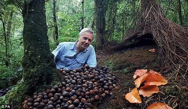 1996年大卫爵爷造访新几内亚岛西部鸟头半岛时,与褐色园丁鸟的求偶场合影。图片:dailymail.co.uk