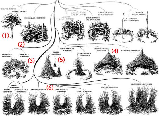 依据求偶场的有无及复杂程度,我们可以大致将园丁鸟分为六大类: