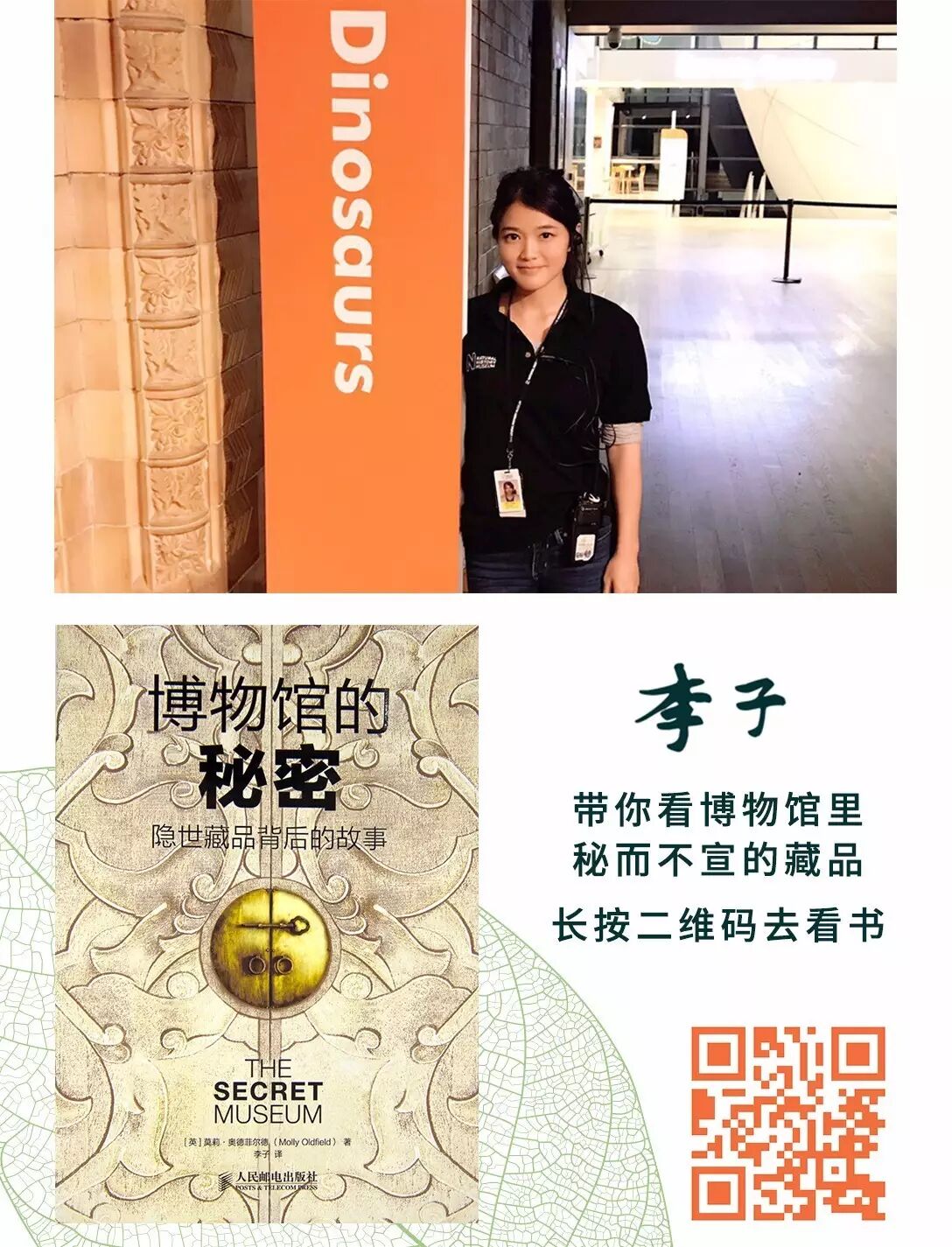 李子:政治社会学出身,物种日历稀有的文系作者,热爱探究物种和历史、文化的关系。博物馆重度沉迷者,在大英自然历史博物馆(NHM)和科学博物馆担任志愿者、讲解员。译著《博物馆的秘密:隐世藏品背后的故事》,微博@李子李子短信 。