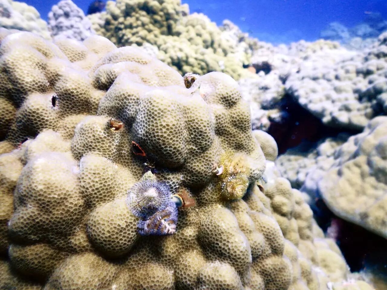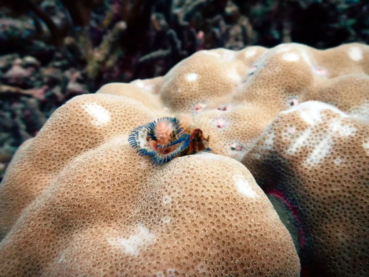 上图这一大块球状的滨珊瑚群体,是无数滨珊瑚虫经历数十年建造出来的大堡垒。这个直径一米有余的堡垒顶部入住了各种小租户,租户们在珊瑚较为疏松的骨骼上开垦出了一片小天地。
