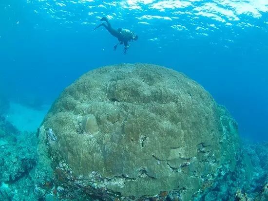 这个巨型滨珊瑚群体,长径超过10米,顶部被其他种珊瑚以及许多生物占据。图片:千野youko