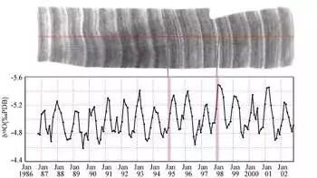 随着季节水温变化,块状滨珊瑚的骨骼生长密度会改变。研究者用钻孔取芯的方式取出滨珊瑚骨骼,用X射线摄影后,深浅纹路仿若古树的年轮,记录着珊瑚本身的骨骼生长速度、年龄、以及当地过去的水温、海水内无机物的变化等信息。东京大学地质科学研究者甚至在巨大的滨珊瑚里找到了1994~1997年热带印度洋偶极子(Indian Ocean Dipole,IOD)的记录。