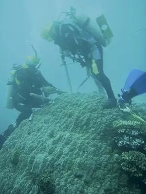 研究人员钻取滨珊瑚骨骼,开展研究。图片:spf.org