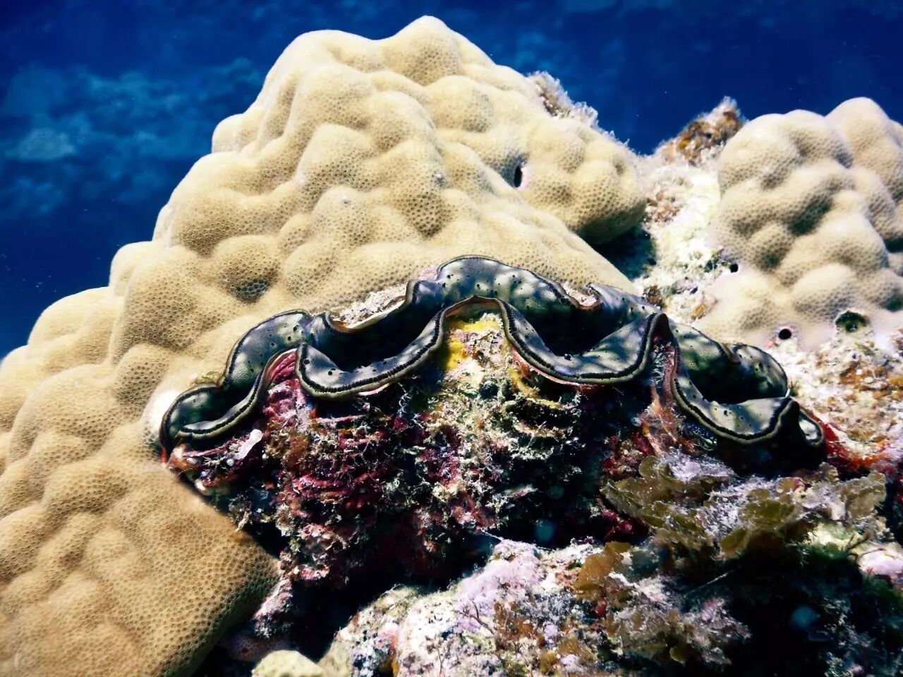 堡垒顶部的特写,砗磲、海胆甚至还有别的珊瑚都已经在滨珊瑚上安了家。图片:千野youko