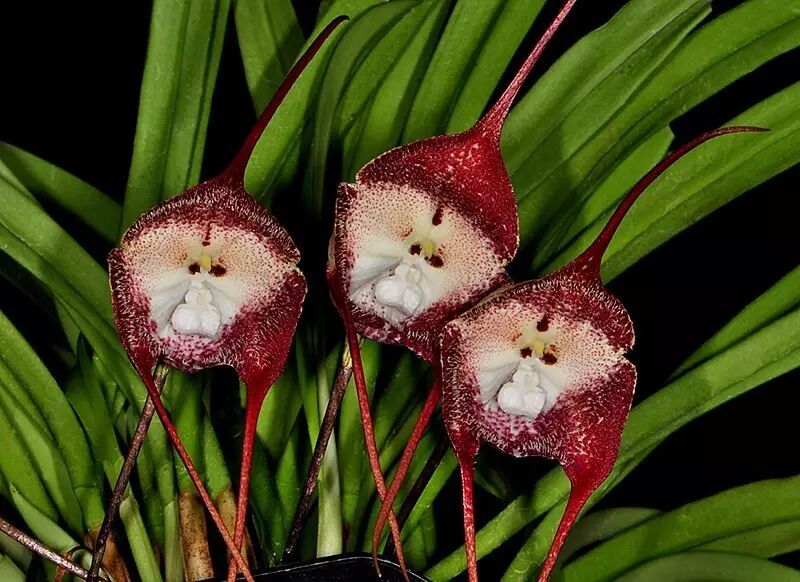 猴面小龙兰属于兰科、小龙兰属的一员。种加词simia是“猴子”的意思,不过你可能会更关注它的属名Dracula,这难道不就是指吸血鬼鼻祖——德古拉吗?德古拉作为吸血鬼,最早出自爱尔兰作家布拉姆·斯托克在1897年出版的同名小说。但在这里,Dracula源自拉丁语的draco,意为“小飞龙”,这大概是与它们萼片先端的长尾尖有关系。