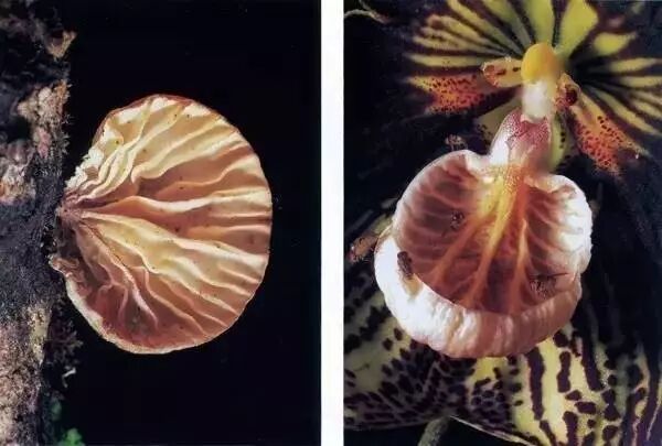 当然不是!小龙兰模仿的是自己的邻居——真菌。研究者发现小龙兰的唇瓣就像一个倒扣的蘑菇,内壁还有类似蘑菇菌褶的结构,甚至能散发出和自己栖息地的蘑菇类似的气味。如此煞费苦心地拟态,是为了吸引食腐的昆虫前来授粉。
