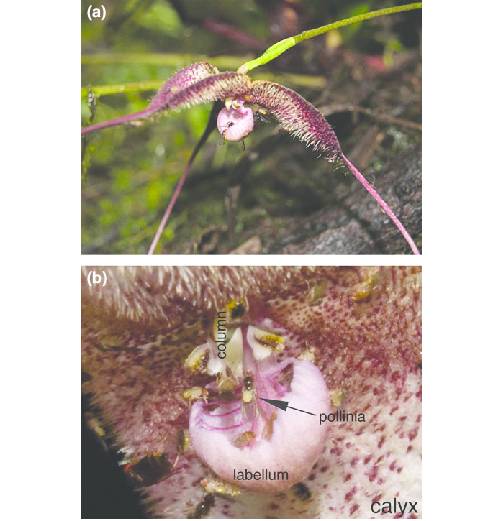 事实证明,有添加气味的那组,吸引了比对照组多3倍的蝇类前来,它们似乎把这当成了交配和产卵的场所。只要无意中碰到小龙兰的花粉块,等这些不知情的蝇类飞抵下一朵花时,便完成了一次授粉使命。