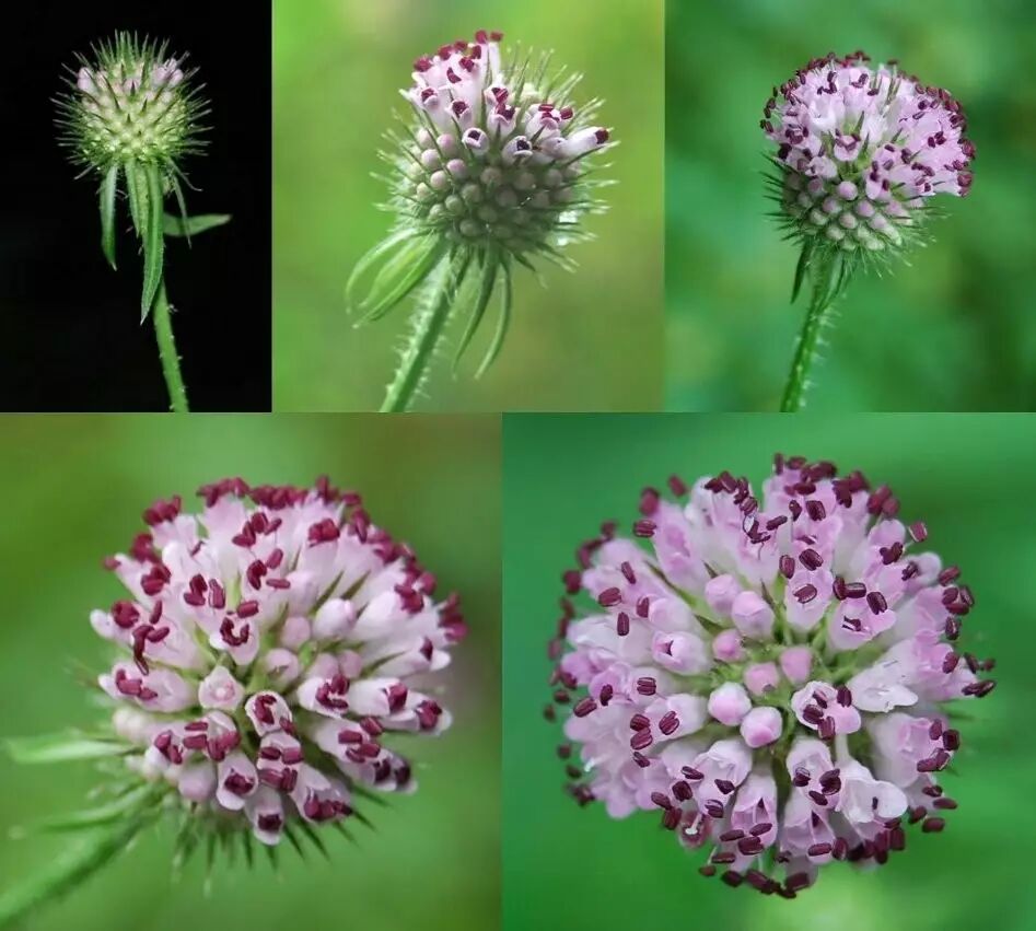 日本续断并非菊花家的成员,而是川续断科(Dipsacaceae)川续断属(Dipsacus)的成员。与大蓝刺头复头状花序不同,日本续断的花序是单一的头状花序,每一朵小花都包裹在一个小苞片之中,这些小薄片的顶端长着5~7毫米的喙尖,上面还长刺毛。贸然摸上去,很容易扎穿皮肤。