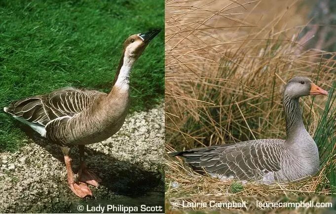 左图:鸿雁的黑色长喙和颈侧分界线;右图:灰雁的橙粉色喙。图片:Lady Philippa Scott、Laurie Campbell / lauriecampbell.com