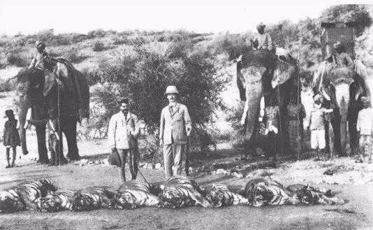 猎户维生、部落自卫,还可看作是人类与虎争夺生态位的拉锯战,但人类的战争从来不只是为了自保。对虎骨、虎皮等虎制品的不当需求,让这些生灵无端蒙受灭顶之灾;获得高超科技后人类耀武扬威,也曾一度将虎逼到绝境。比如英国殖民印度后,曾经和印度王公串通一气,一股脑地去猎杀这个大部分欧洲人没见过的猛兽,为的就是单纯地炫耀。与此同时,遭罪的还有印度犀、印度野牛等。