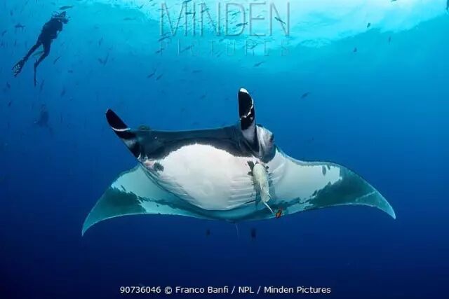 双吻前口蝠鲼(Manta birostris)是体型最大的一种蝠鲼,它的“翼展”超过7米,体重可达1.3吨,凭借硕大的身形、强大的力量和令人生畏的外表,也被人们称为“魔鬼鱼”。