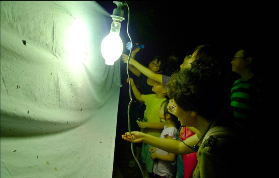 到了夜晚,跟着昆虫达人去捕虫,学习灯诱,了解昆虫知识。