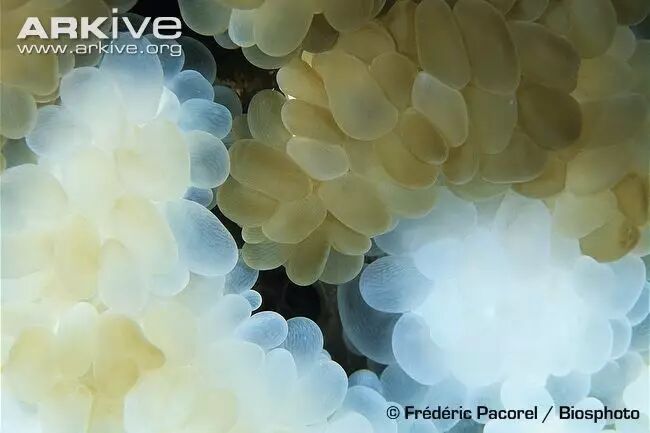 泡囊珊瑚的颜色主要来自虫黄藻,数量不同会造成颜色的差异。图为发生白化的泡囊珊瑚。图片来源见水印