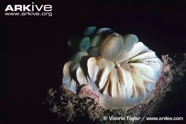 夜晚,收起囊胞的泡囊珊瑚,石灰质骨骼清晰可见。注意它也是可以分泌形成石灰质骨骼的,所以才能造礁。图片来源见水印