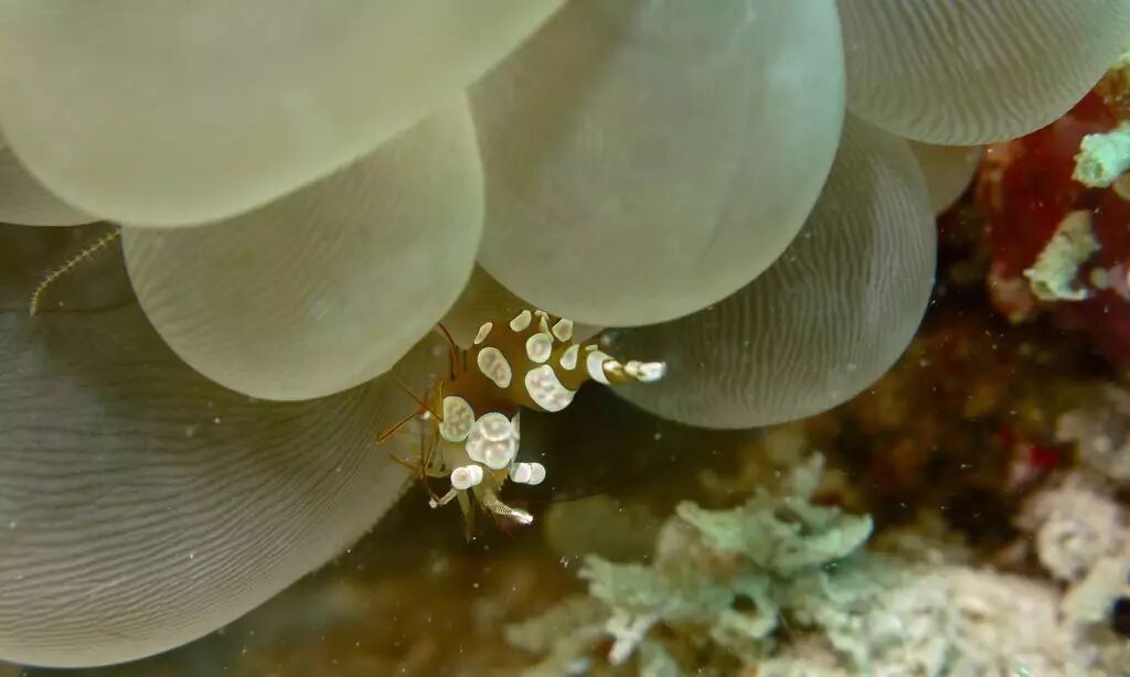 在鼓起的小囊胞之间,身形小巧的珊瑚虾、珊瑚蟹进出自如,在缝隙中的求生让它们远离被捕食者一口吞的危险。与此同时,泡囊珊瑚表面分泌的富含蛋白质的粘液、沾上的藻类,甚至泡囊珊瑚吃剩的“夜宵”残渣,也是这些共生小伙伴的美食。