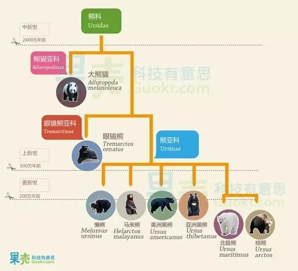 熊科动物的进化和分类图。制图:果壳网友@V晶V ,信息来源:giantpandaonline.org