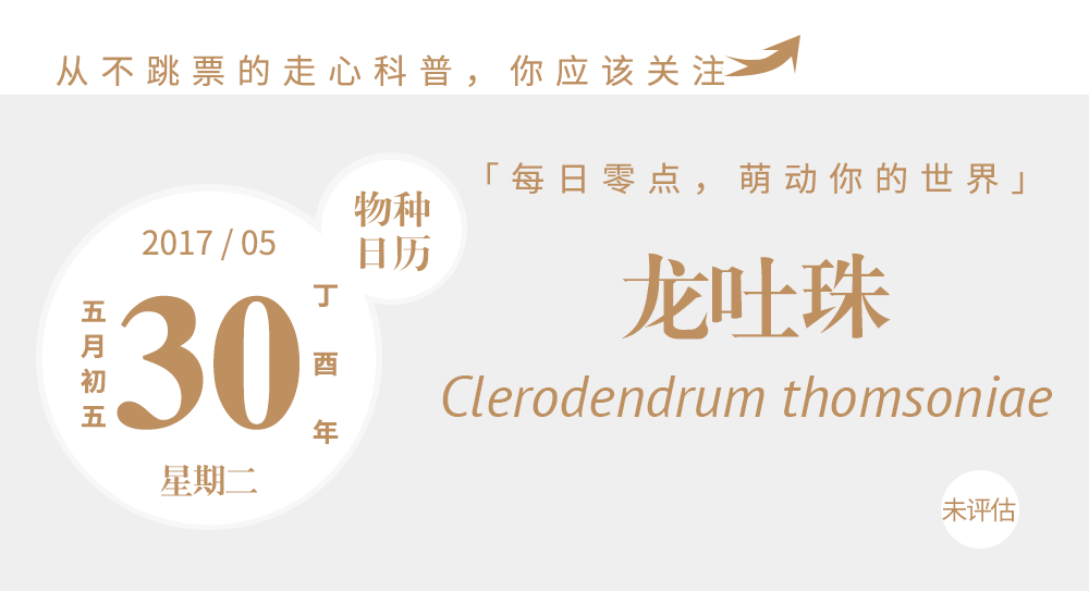 龙吐珠原产非洲西部的热带地区,在旧的植物分类系统中,被划分成马鞭草科大青属,近年来根据分子证据,将它和马鞭草科中的大部分属一起被划归唇形科,跟薄荷和薰衣草攀上了亲戚。大青属的属名Clerodendrum是前几天刚过完生日的林奈林老师起的,由kleros(命运)和dendron(树)两个希腊语单词构成,之所以叫“命运树”这个中二风十足的名字,是因为古人把这个属中的一些物种用于宗教用途。