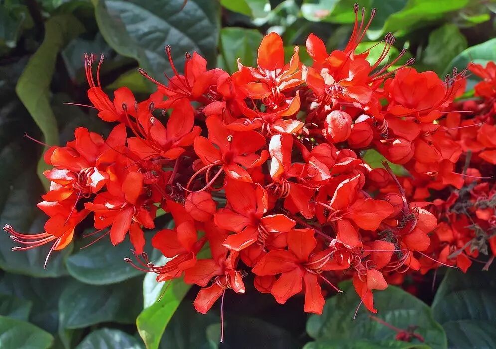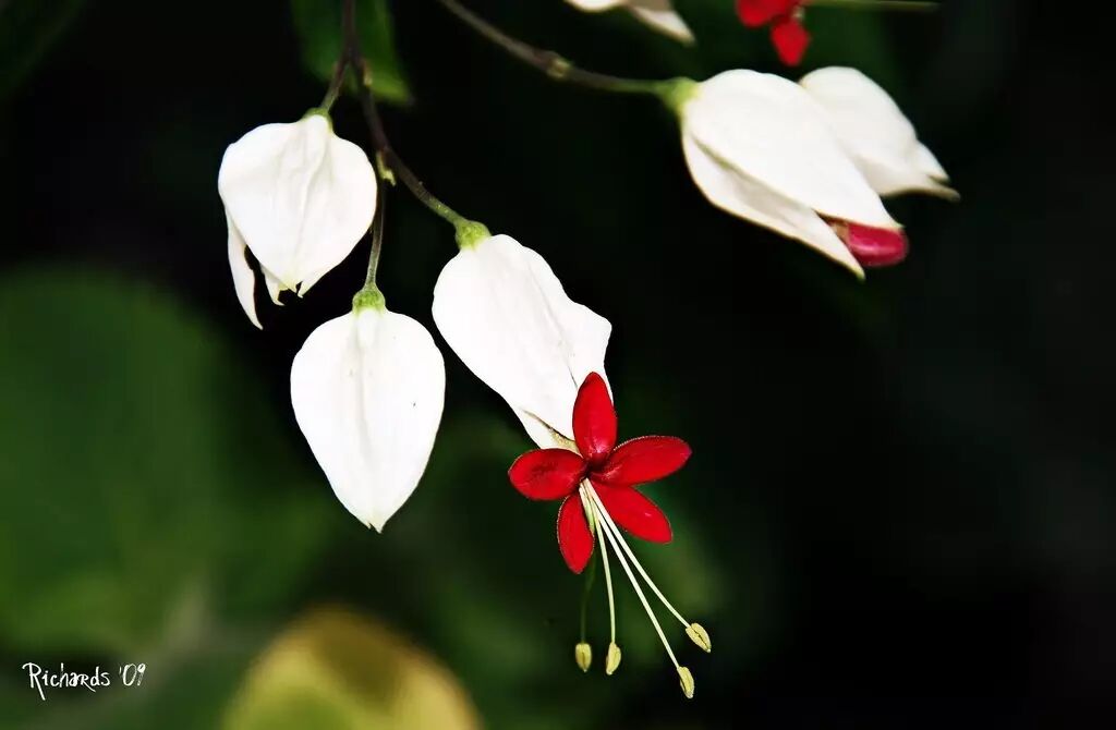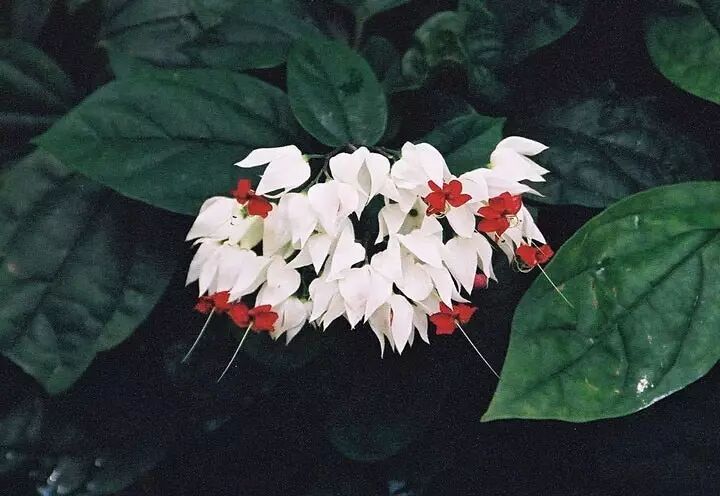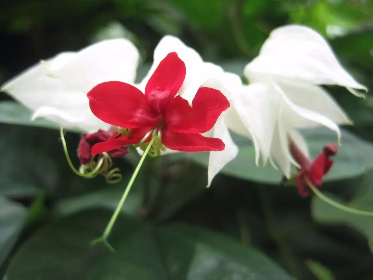 到了花期,龙吐珠的辨识度立马会上三个台阶,红白分明的花令人过目难忘。白色部分是它的萼片,基部合生到一起,还没开的时候就是个白色的心形灯笼,萼片顶端的五个裂片之间突起形成脊,让它看上去又像一个个洁白的小杨桃。红色部分则是龙吐珠的花瓣,下方合在一起成管状,刚钻出苞片时还没开放,就是一个小红球,完全展开后就会看到五个正红色的花冠裂片。
