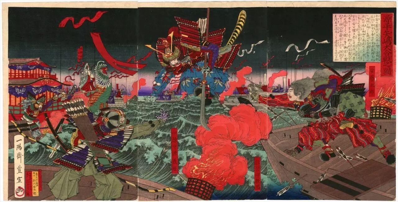 源平矢嶋大合戦,看飘扬的红色、白色旗帜,龙吐珠的“源平臭木”之名由此而来。图片:歌川豊宣(1882)