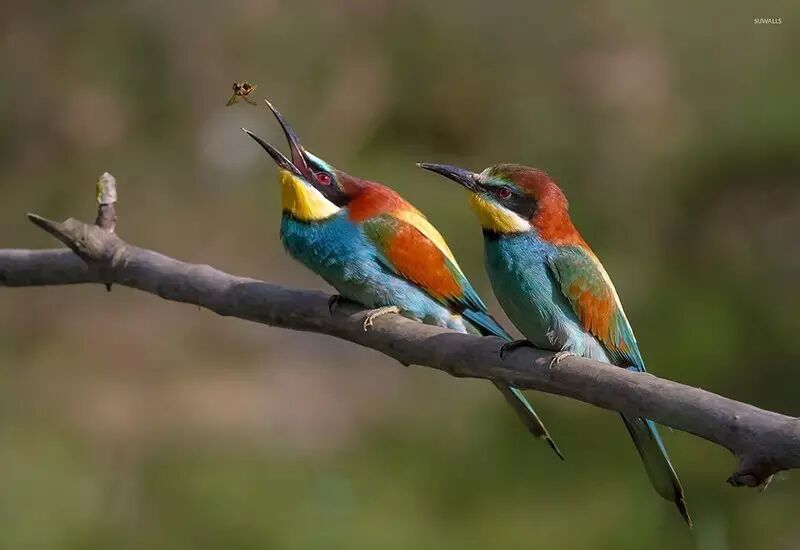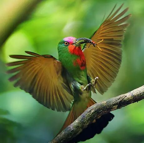 蜂虎不怕蜜蜂和胡蜂的蜇针,捕捉到这些昆虫后,它会在树枝上反复敲击猎物,去除猎物的毒液和刺针,然后将猎物抛起,直接落入口中。
