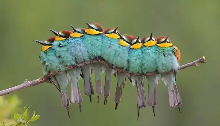 虽然黄喉蜂虎的社会充满了背叛、欺瞒和骚乱,却懂得如何把最美好的一面展现给观众。它们在洞外相处和谐,经常群飞于山脚、耕地、河岸等开阔地带,金棕色的羽毛在明亮的阳光下异常显眼,或是几只同时落在一块,做着同样的动作,保持高度的一致性,谁又会去想这美丽的鸟貌合神离、心怀鬼胎呢。