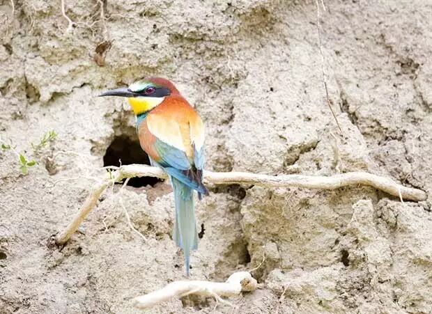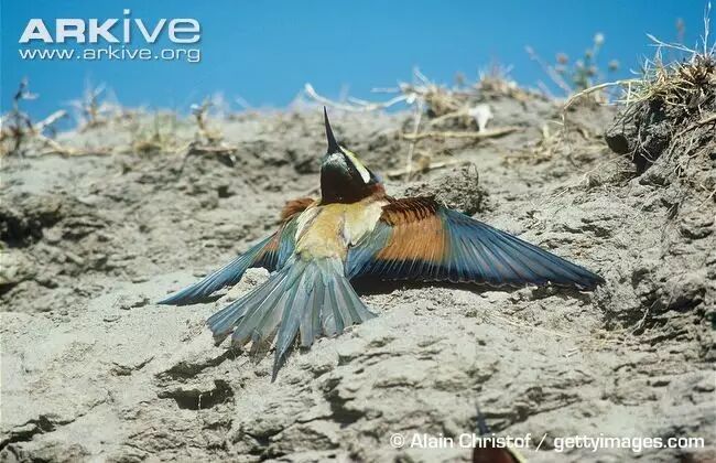 黄喉蜂虎的巢址大都选在土质的河岸或山坡,在坚硬的土墙上面挖掘洞穴,洞穴深度可达1.5m,直径约8cm。最内部有相对开阔的育雏室。图片:britishbirdlovers.co.uk