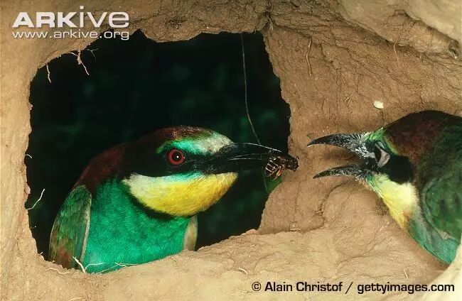 黄喉蜂虎喂养幼鸟。图片来源见水印