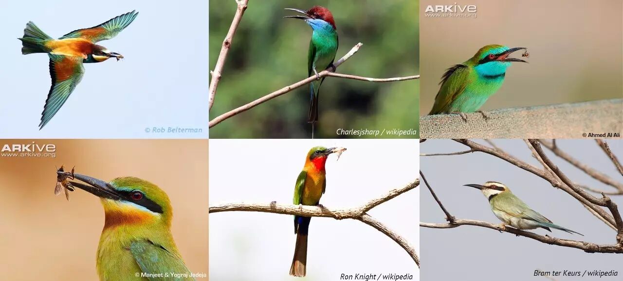 “多彩喉蜂虎家族来也:老大黄喉蜂虎!老二蓝喉蜂虎!老三绿喉蜂虎(M. orientalis)!老四栗喉蜂虎(M. philippinus)!老五赤喉蜂虎(M. bulocki)!老幺白喉蜂虎(M. albicollis)!”(以上排名,纯属娱乐。所提蓝喉蜂虎、绿喉蜂虎、栗喉蜂虎国内有产,体型均小于黄喉蜂虎。) 图片来源见水印