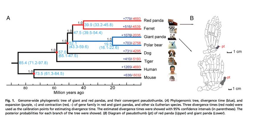 今年年初,中国科学院动物研究所魏辅文研究团队在PNAS上发表了野生小熊猫全基因组测序的结果。在比对了小熊猫的基因组序列与重新组装的大熊猫基因组序列之后,研究人员发现了70个在演化中经历了相同改变的基因。这其中就包括两个参与四肢发育的基因:DYNC2H1 和 PCNT。