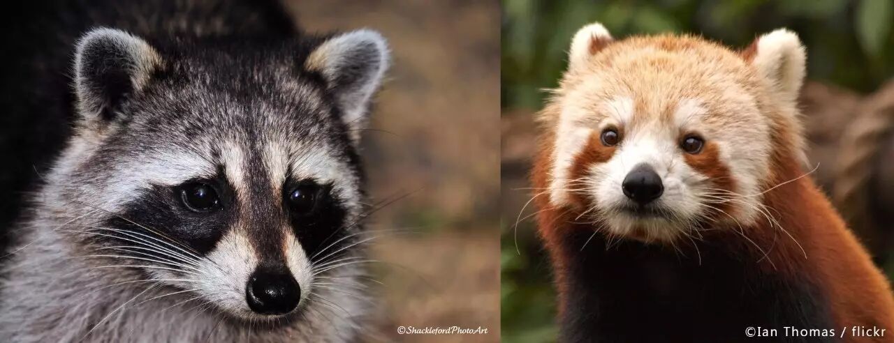 左为浣熊,右为小熊猫,从面部就可看出较大区别;相比于浣熊,小熊猫脸盘宽而嘴短,耳朵是白色的宽三角形。图片来源见水印