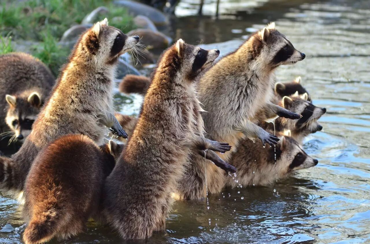 换句话说,浣熊拿到食物之后洗一洗,实际上是拿水泡泡爪子之后上上下下再彻底把食物感受一遍。这个动作会被误会为“洗”也很正常。浣熊在英语里面racoon这个名字的来源,也有人认为是美洲原住民的亚尔纲津(Algonquian)的“ahrah-koon-em”,原意是“用手揉搓东西”,这或许是更确切的比喻吧?
