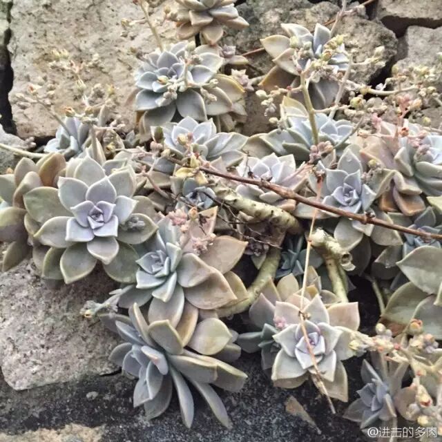 胧月被老外称之为“ghost plant”,也就是“鬼魂植物”,我想,这大概是和它们灰白色的叶片有关。胧月的叶片宽大,呈倒三角的长匙形,叶片一般是青灰到灰白色,老叶干瘪脱落,在茎干上留下明显的叶痕,新叶层层叠叠地,在枝端排列成莲座状,倘若能形成老桩,那必定是俊美非凡。但若没有丰富的色彩和可爱的造型,胧月就不太符合现代人对于“萌”的定义了。待在墙角默默无闻的它,只有在日照充足、温差较大的日子,才可能唤起你的注意——雾蒙蒙的“脸颊”稍微染上了一抹不均匀的粉嫩,哦,原来胧月还蛮美的。