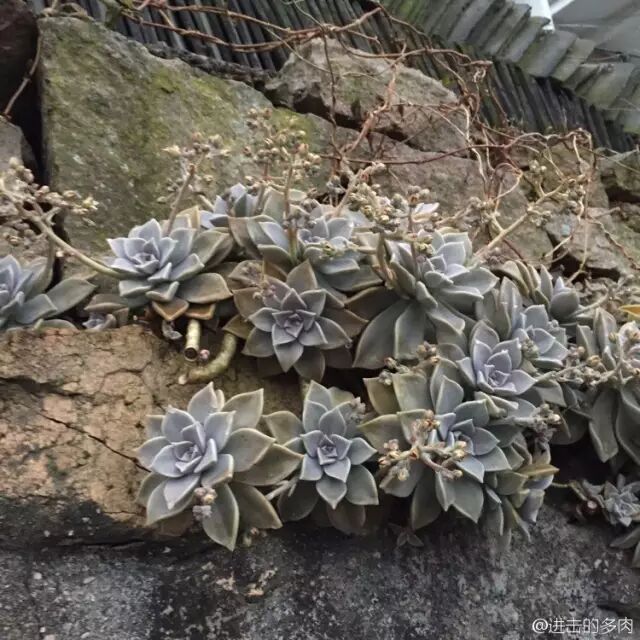 当时它还不叫“胧月”这么洋气的名字,而是叫“宝石花”。不过,这并不是胧月独享的名号,国人把东美人、胧月之类有着莲座造型叶片的多肉,都统称为“宝石花”。那时候,几乎每户人家阳台都有“宝石花”,掰一片叶子,剪一个短枝,随便往土里一插,过一些时日就发芽成活;而且皮实好养,不怕虫害,不用几年就蔚为壮观。每次走在偏僻的巷子里,我总是要抬头,期望能有幸遇到“宝石花瀑布”。